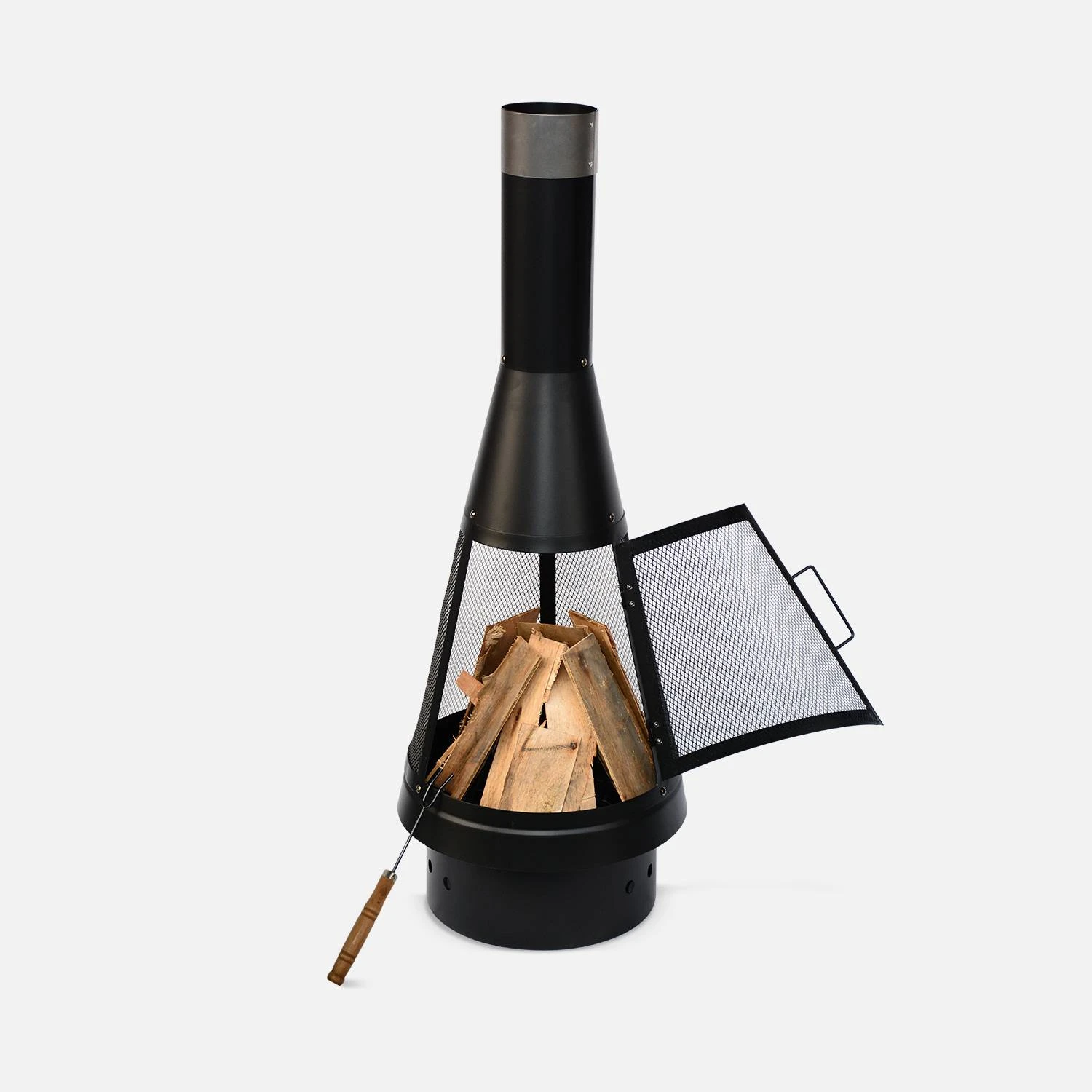 Grâce à une porte d’accès en façade, il est simple d’ajouter ou de manipuler le bois dans le foyer, à l’aide du tisonnier fourni. Ce braséro est en acier recouvert d’une jolie peinture noire, résistante à la chaleur. Les grilles qui entourent le foyer permettent de diffuser la chaleur tout autour de lui. La grille placée en bas du foyer, quant à elle, évite aux braises de s’étouffer avec les cendres. Le poêle de terrasse est sur une base dotée de 6 trous d’aération pour ventiler en dessous du foyer, et donc atténuer l’impact de la chaleur sur le sol pour préserver la pelouse ou la terrasse.