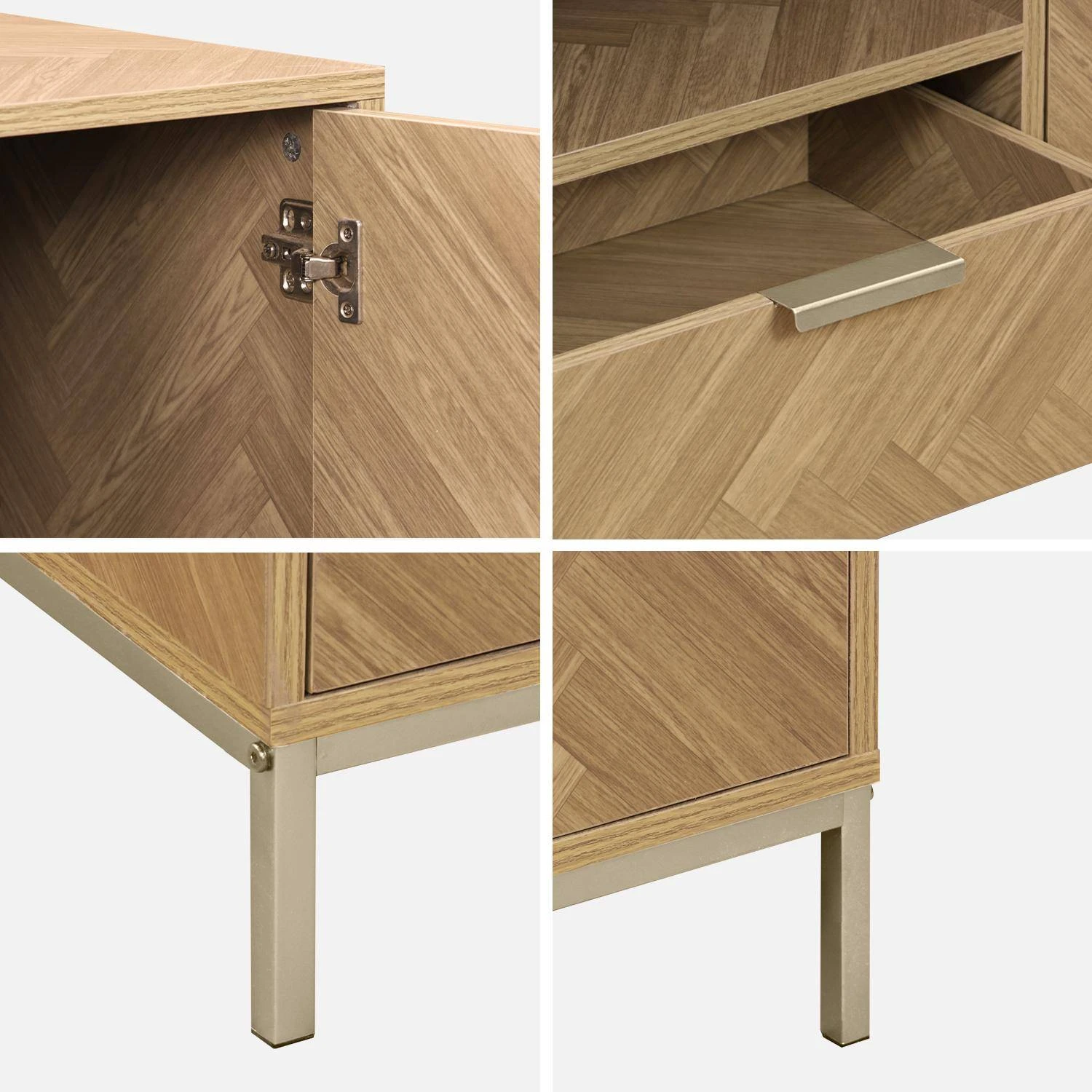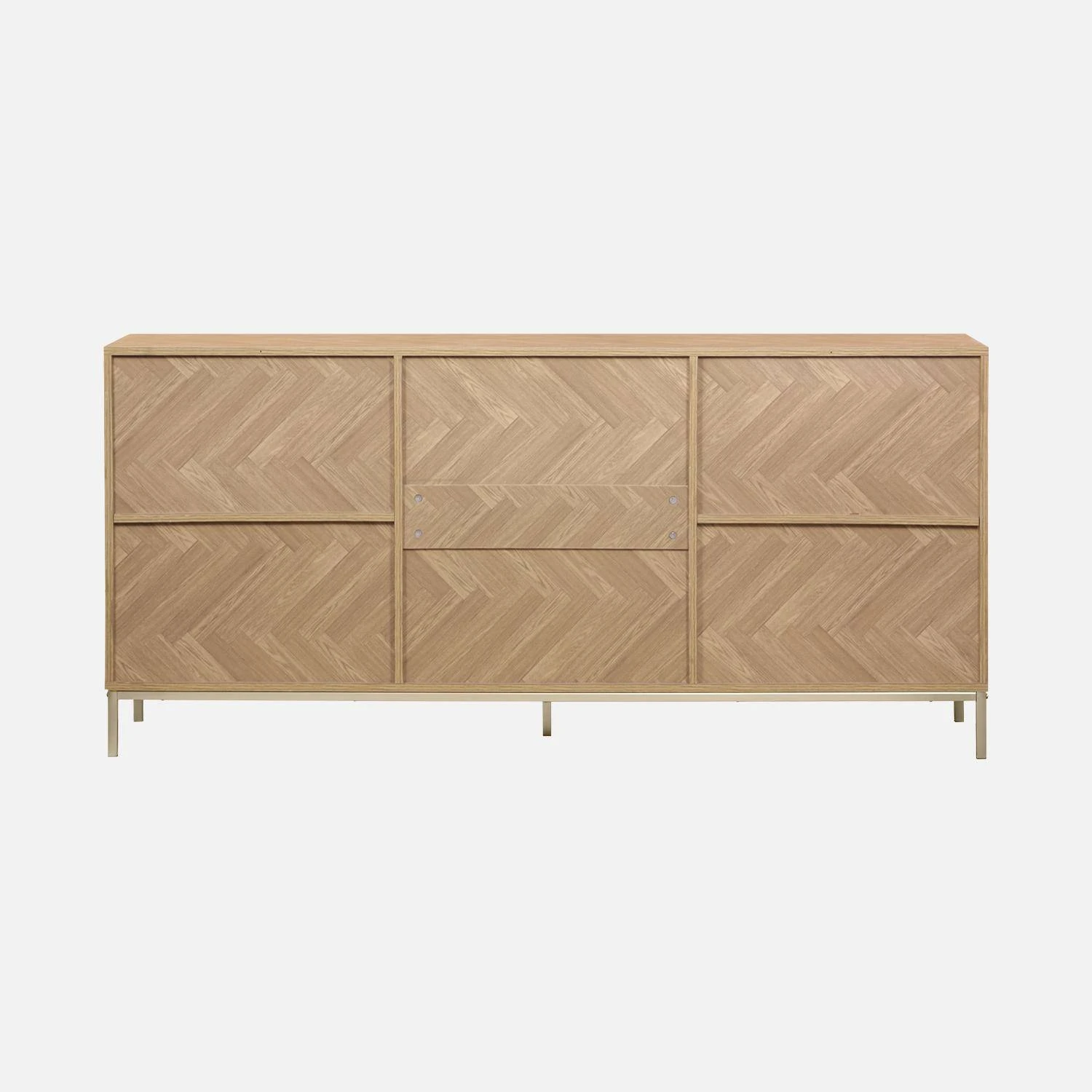 Ce meuble s’inspirant du parquet point de Hongrie est à la fois original et élégant. Son décor chevrons lui apporte toute son authenticité et son raffinement. Accompagné de détails en métal couleur champagne sur ses poignets et piétements, ce meuble réhaussera la décoration de votre intérieur. Son design plutôt contemporain se fondra parfaitement à tous types de déco.