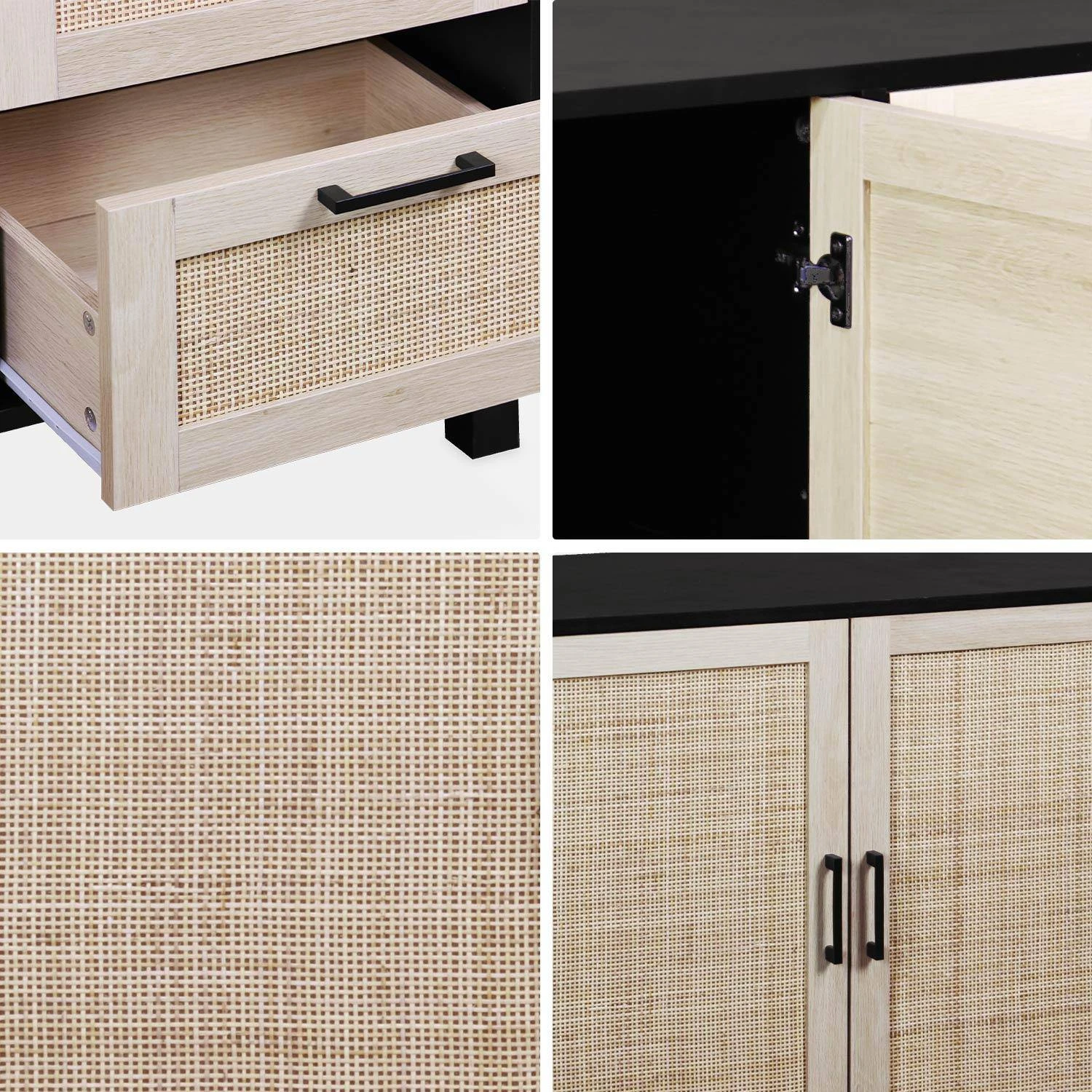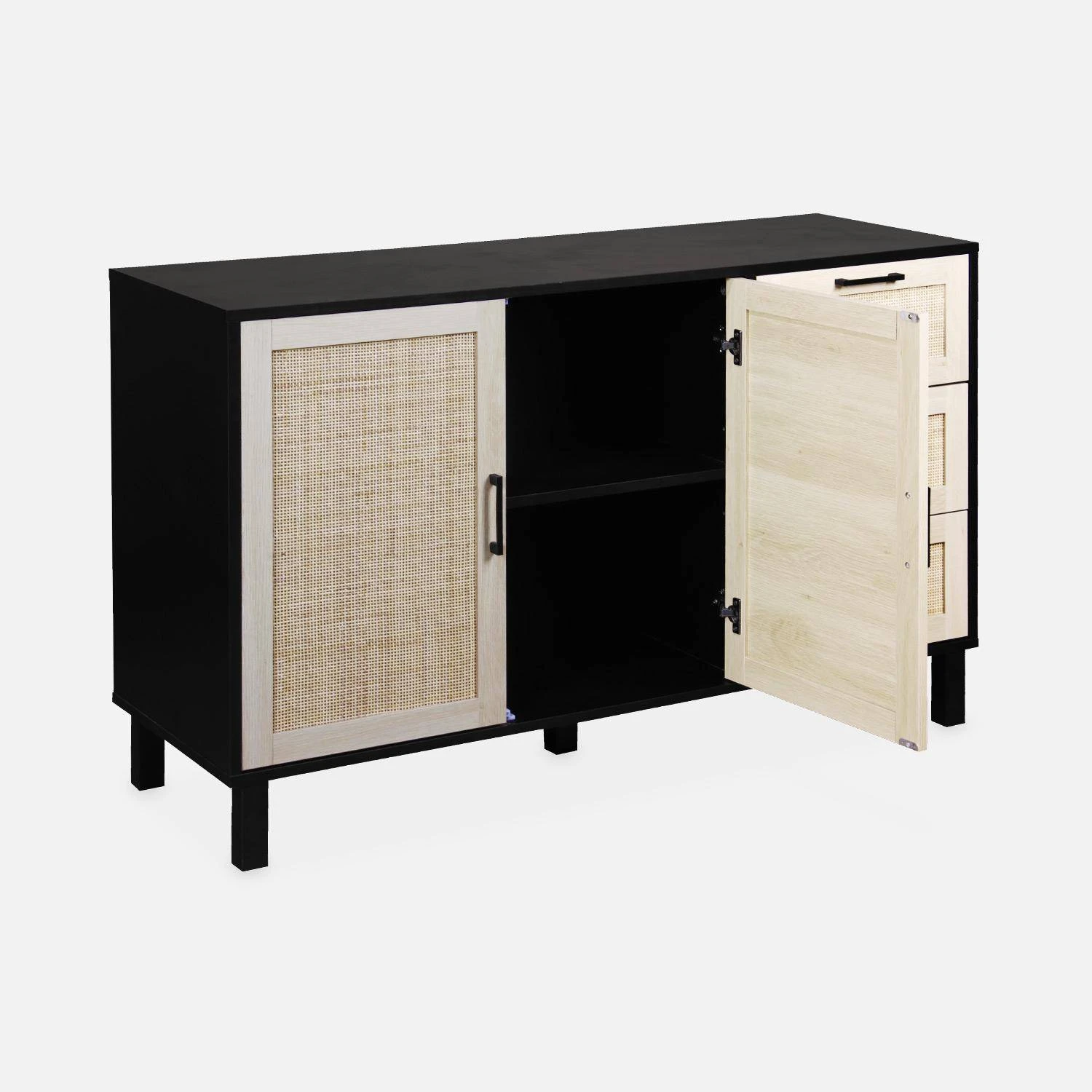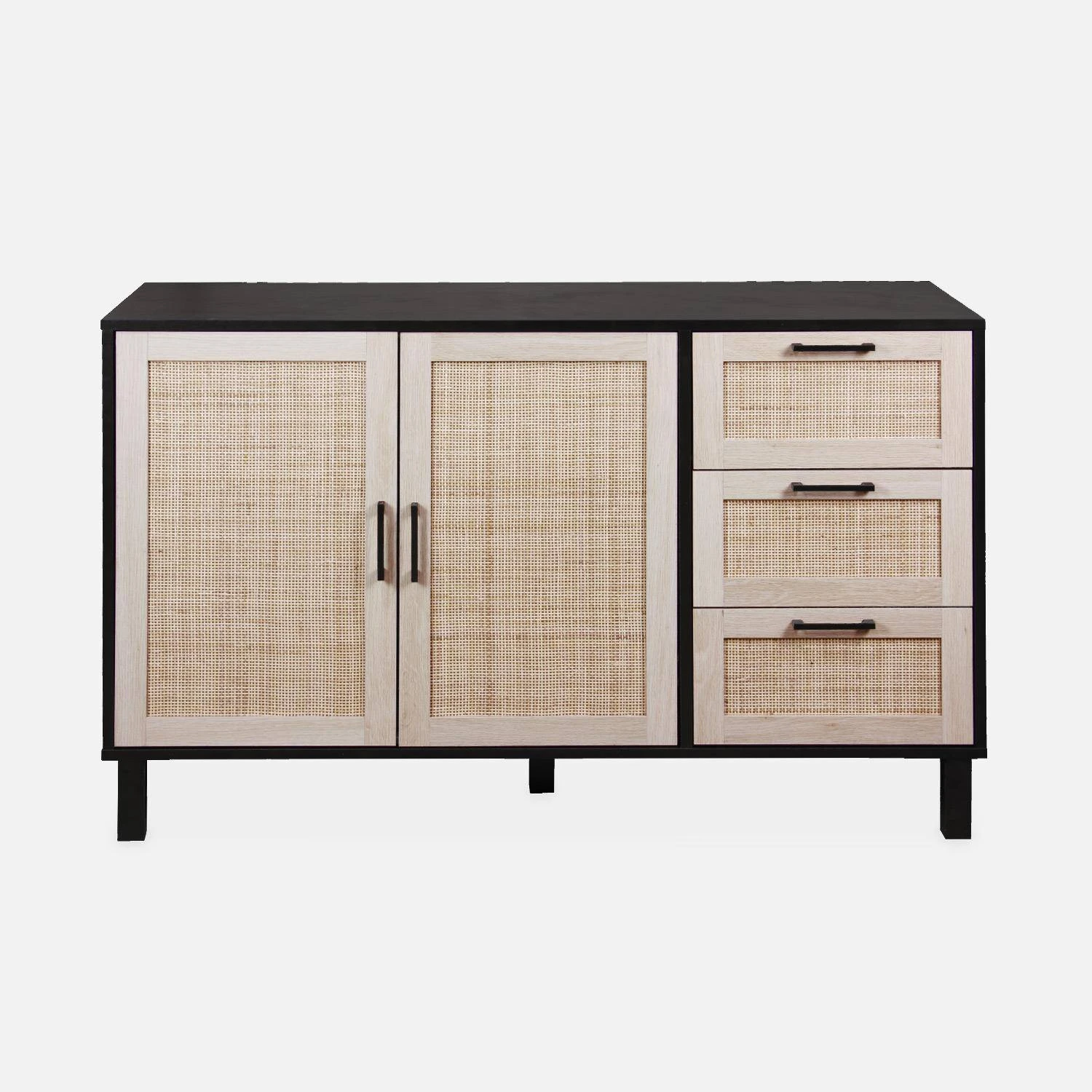 L’esprit vintage s’invite dans votre intérieur avec ce buffet de rangement au charme scandinave. Le noir se marie parfaitement avec le cannage qui habille le meuble avec élégance. Ses pieds carrés et ses poignées noires en font une pièce moderne et originale qui se distinguera dans votre intérieur.