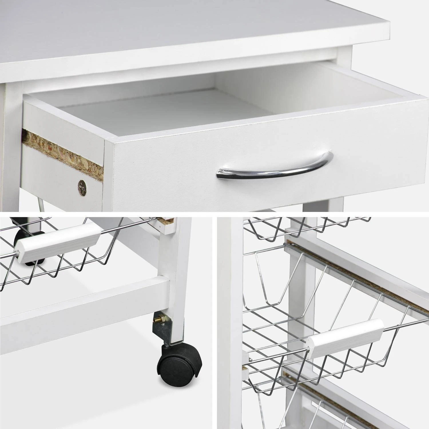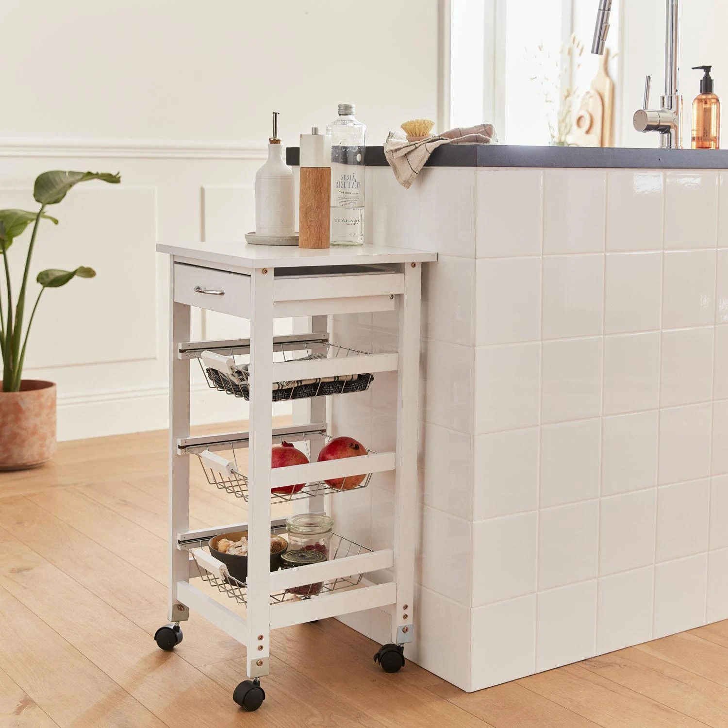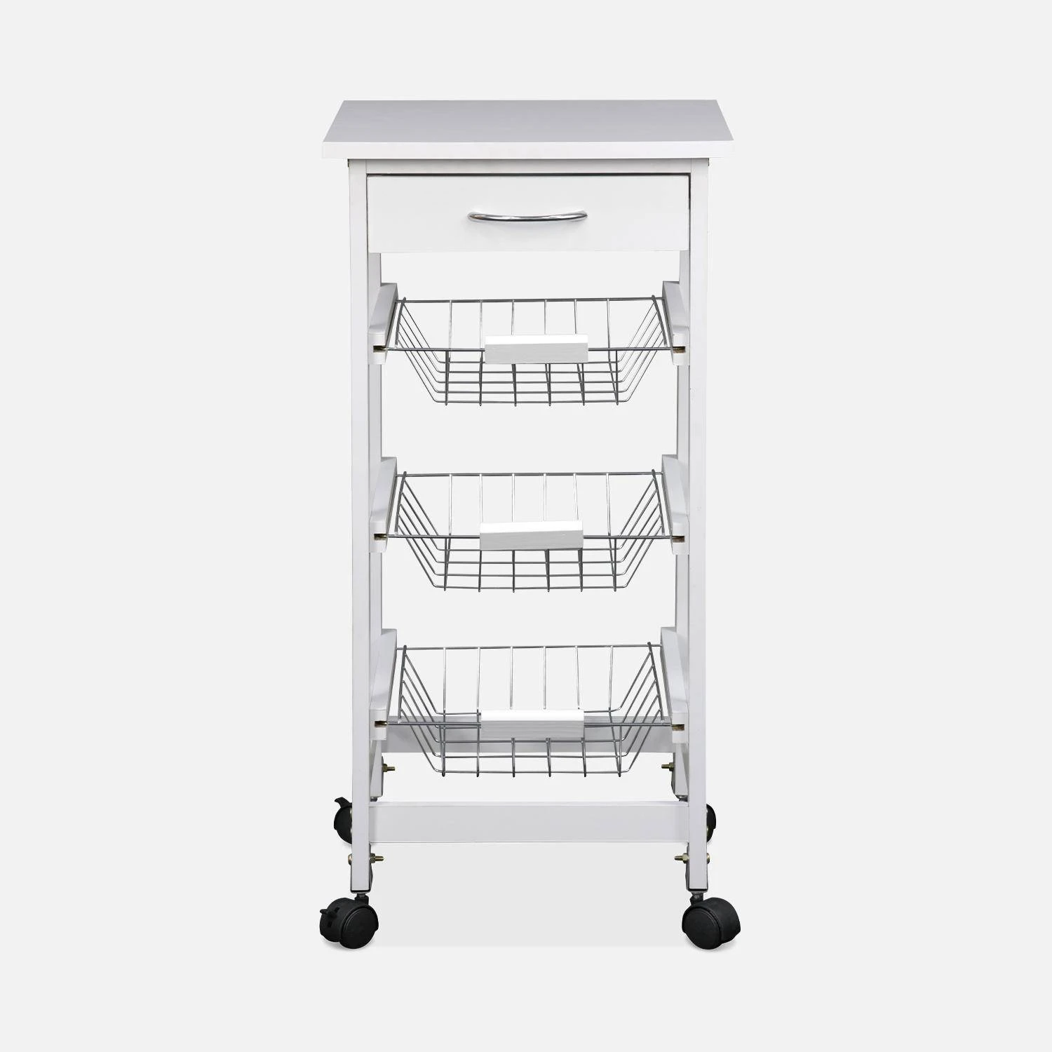 Plus de place pour ranger vos conserves, fruits ou légumes? Cette petite desserte de cuisine à roulettes est le meuble d’appoint idéal pour stocker aliments et autres ustensiles de cuisine. Vous pouvez également ranger couverts ou autres objets au sein du tiroir. 3 paniers en acier inoxydable sont à votre disposition pour un rangement facile. Simple et discrète, cette desserte s’adaptera facilement à n’importe quel type d’intérieur. Pour finir, les roulettes munies de freins permettront de déplacer aisément la desserte entre la cuisine et la zone de repas.