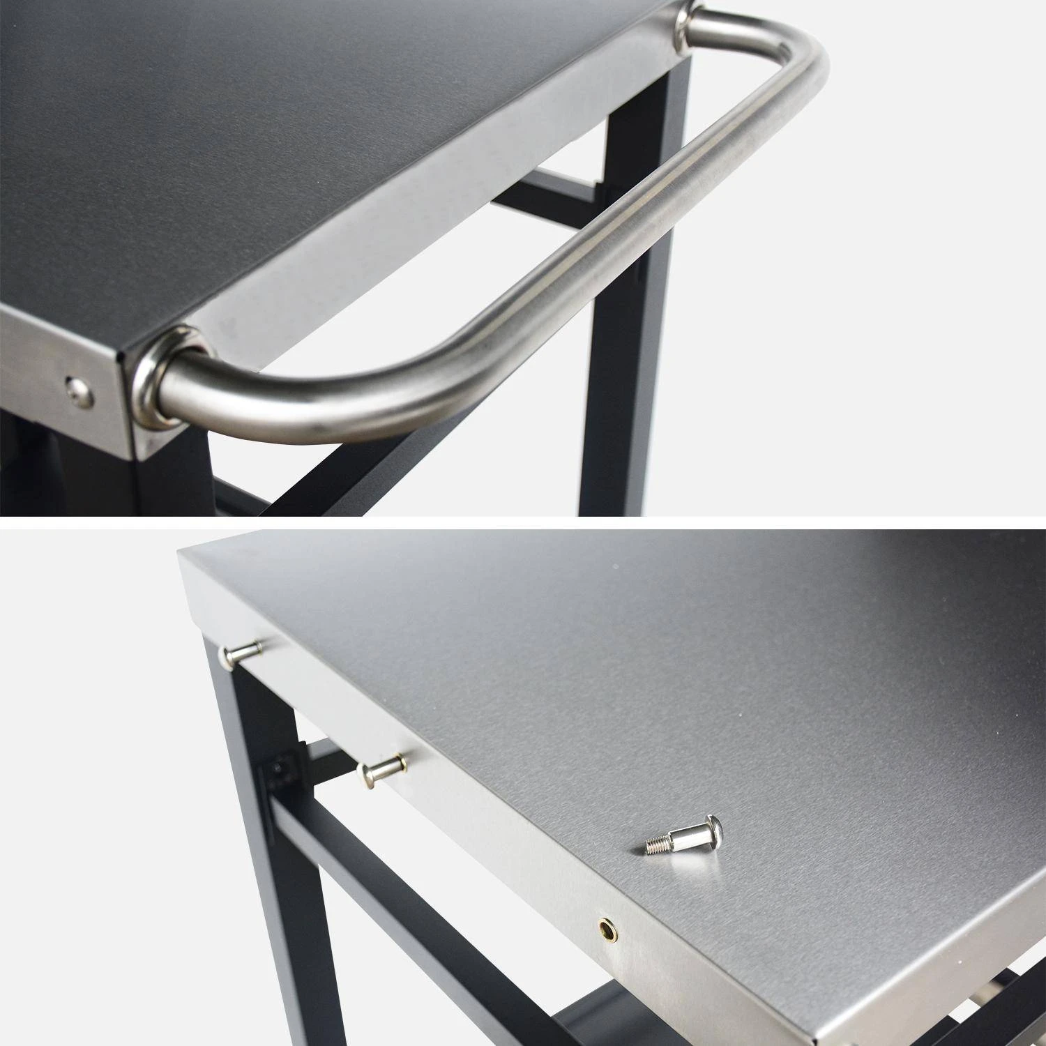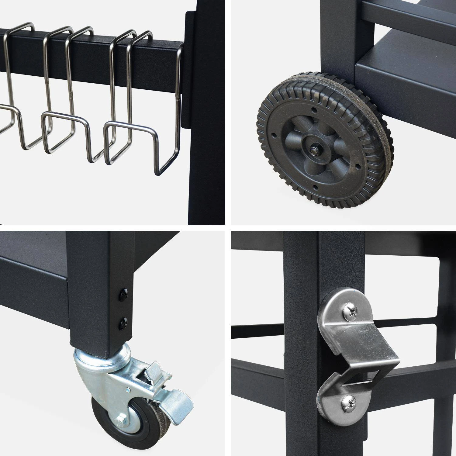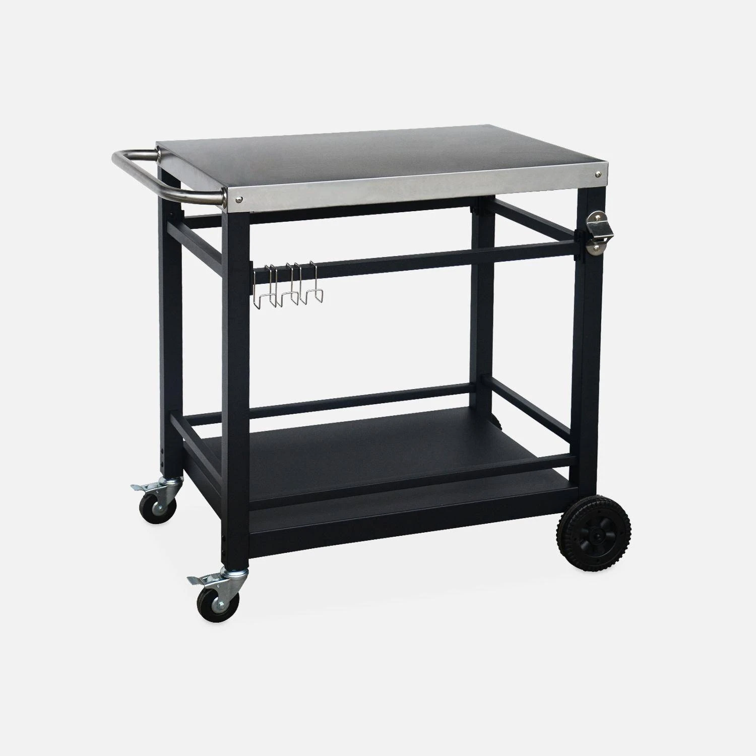 Cette jolie desserte au design intemporel en acier noir est parfaite pour votre jardin ou balcon. Ses 3 crochets vous permettent de placer torchons et ustensiles de cuisine lors de vos soirées plancha entre amis ou en famille. Sur son plateau supérieur, vous pourrez y mettre votre plancha ou tous vos aliments. C’est vous qui décidez grâce à cette desserte ! Quant à sa partie inférieure, vous pourrez y mettre assiettes, plats ou encore bonbonne de gaz pour votre plancha ! Placez un moment convivial grâce à Colbert !