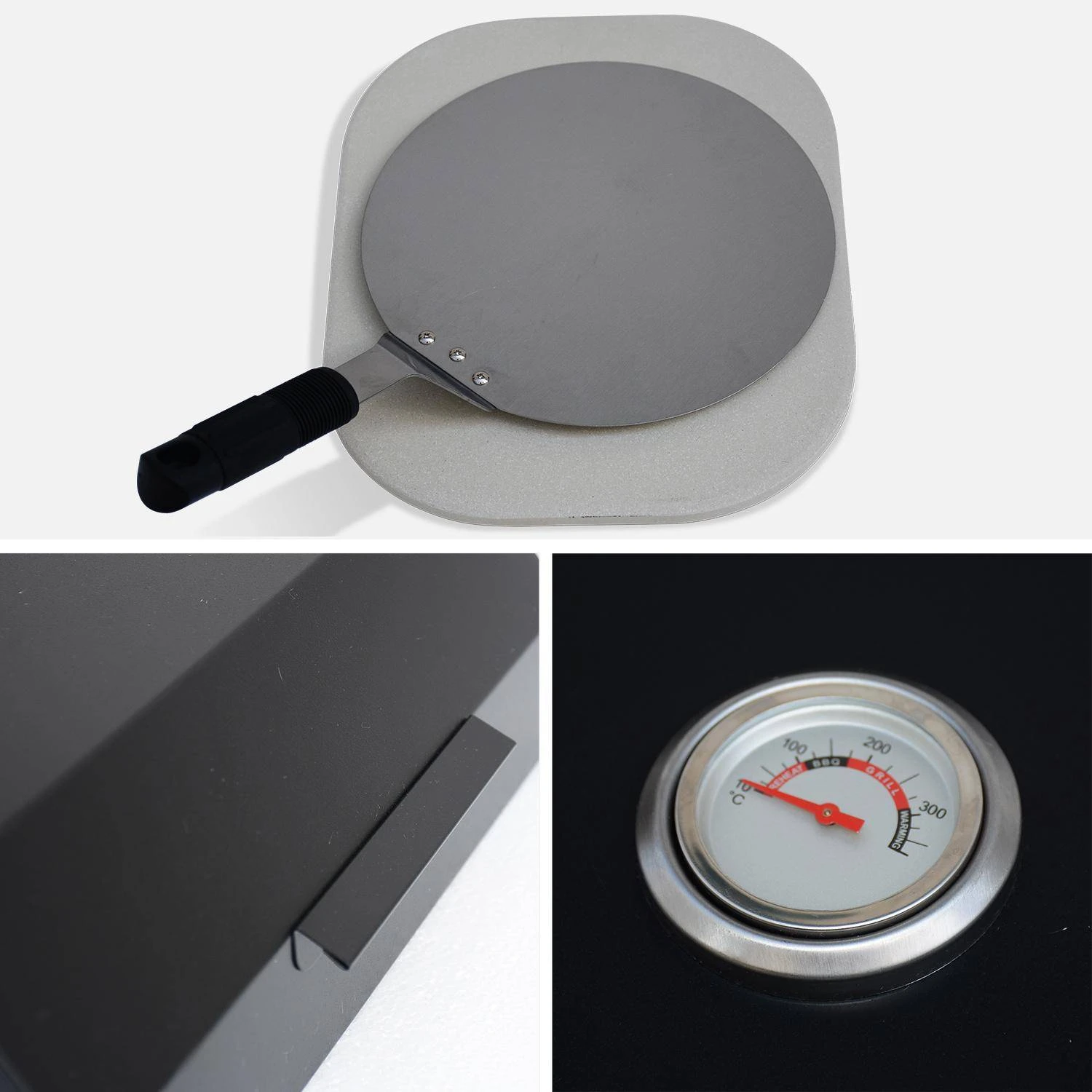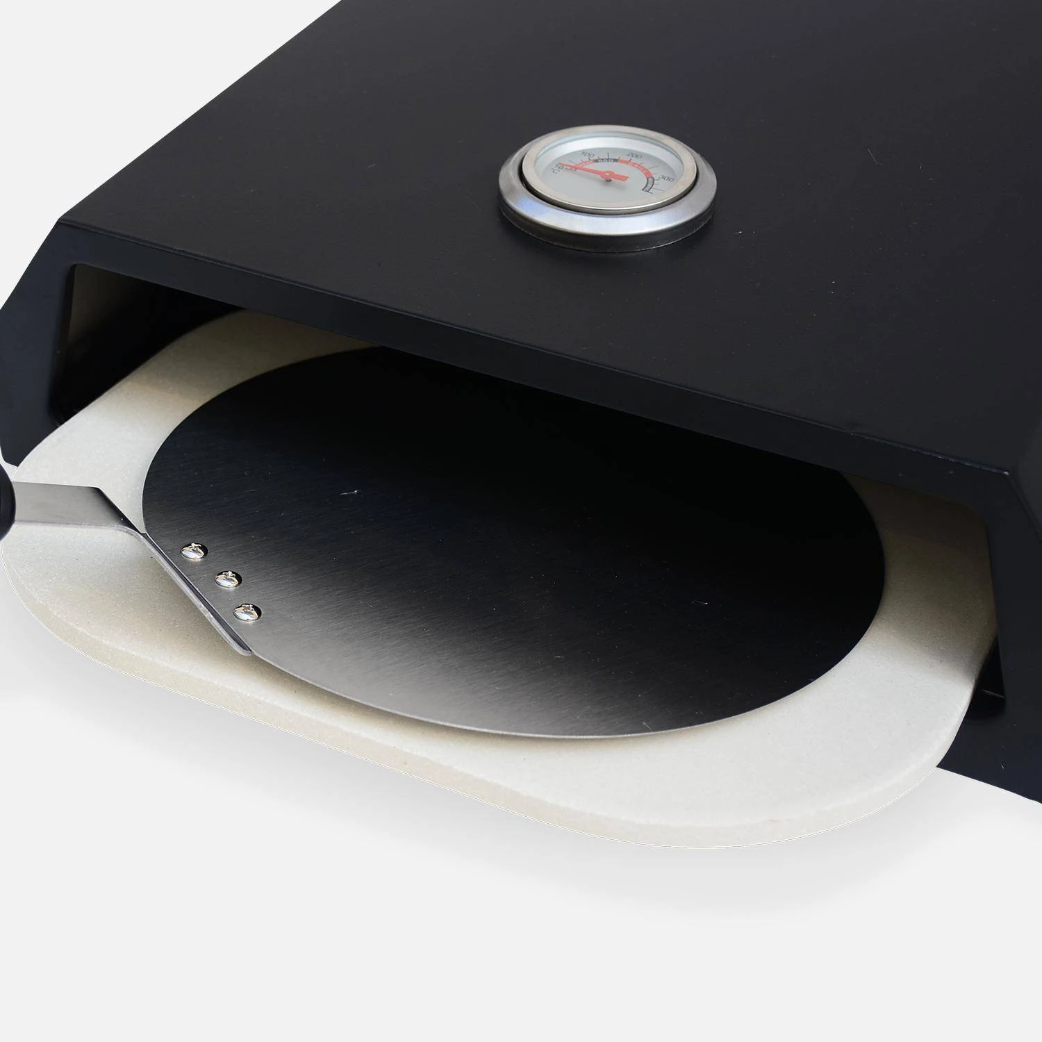 Cet accessoire rectangulaire transforme un barbecue gaz ou charbon en four à pizza, mais vous pouvez tout aussi bien y cuir du pain ! Pour ce faire, placez le sur la grille de cuisson de votre barbecue. Pourvu de deux poignées et portatif, il est très simple d’utilisation. Un thermomètre est intégré pour vous permettre de surveiller la température. Le four à pizza est livré avec une pelle à manche en bakélite, matière isolante et résistante à la chaleur, qui permet de rentrer et sortir les aliments en toute sécurité. Sa pierre de cuisson de 12mm d’épaisseur est idéale pour des pizzas de 30cm de diamètre ou moins.