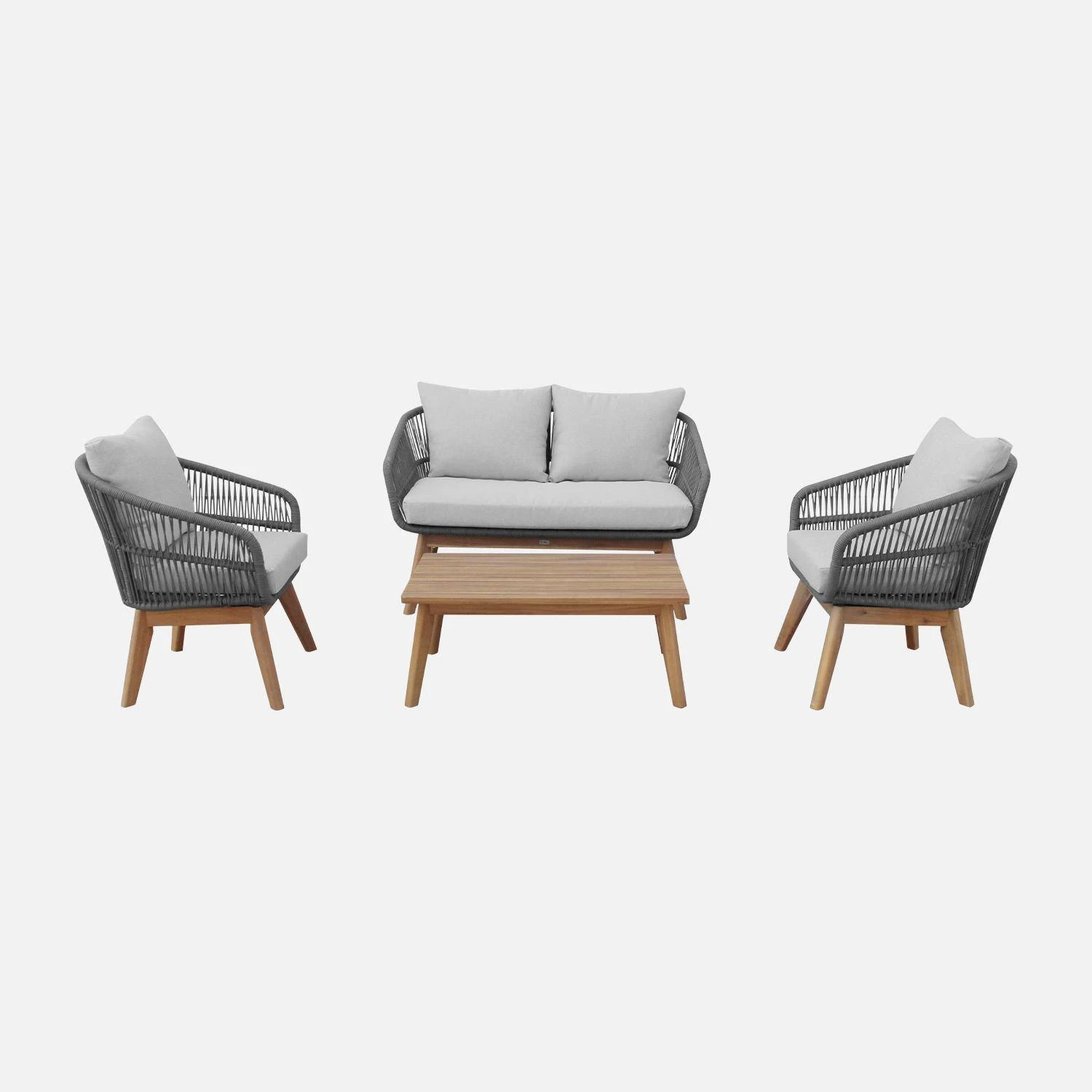 Non seulement design, le Rosario est aussi un produit de qualité. Son tressage est artisanal et bien pensé. Une corde horizontale rigidifie la structure et offre un bon maintien du dos. La structure est en aluminium qui, contrairement à l’acier, ne rouille pas et est léger. Les pieds sont en bois d’acacia 100% FSC, un bois respectueux de l’environnement et de la gestion des forêts. Les coussins sont moelleux, déperlants et déhoussables.