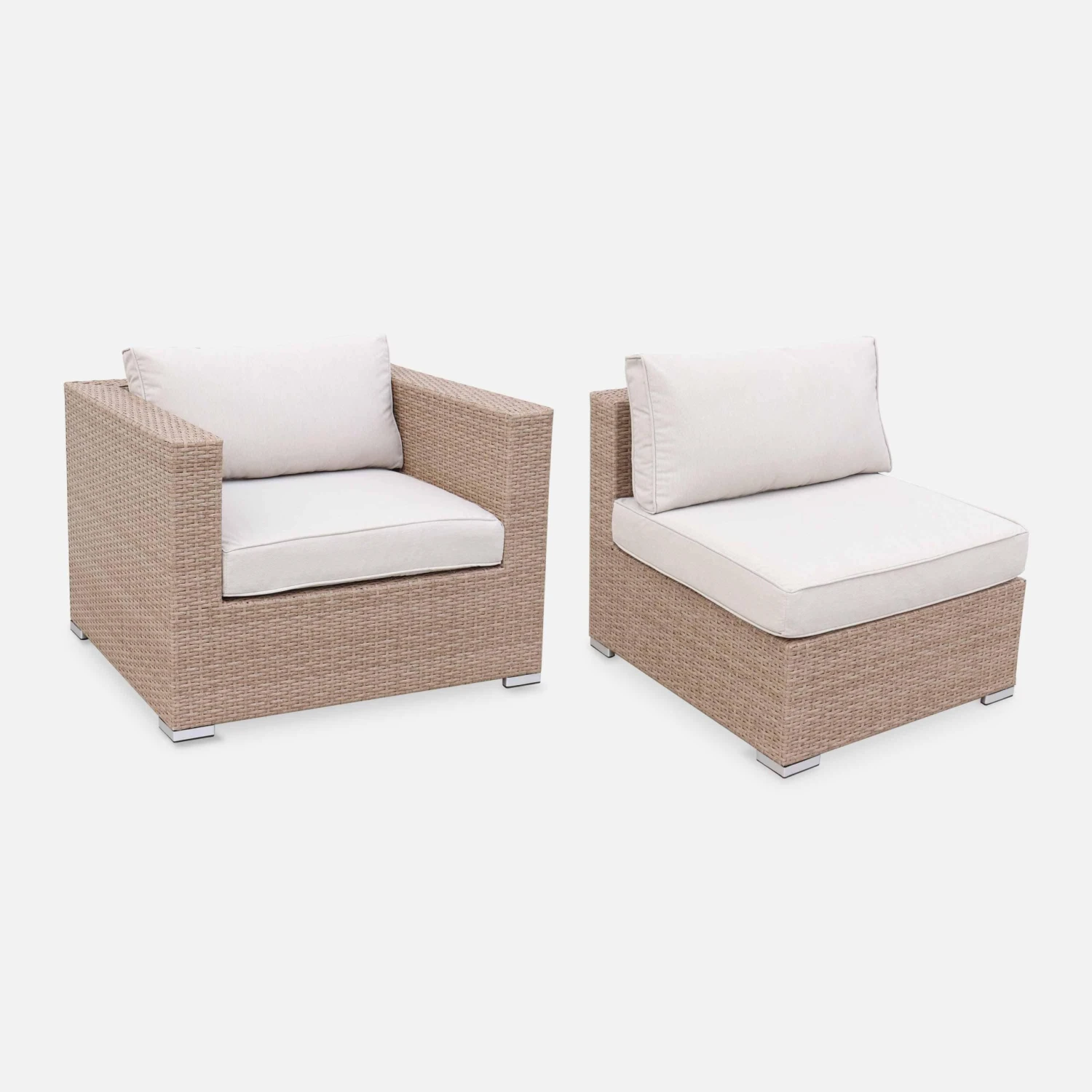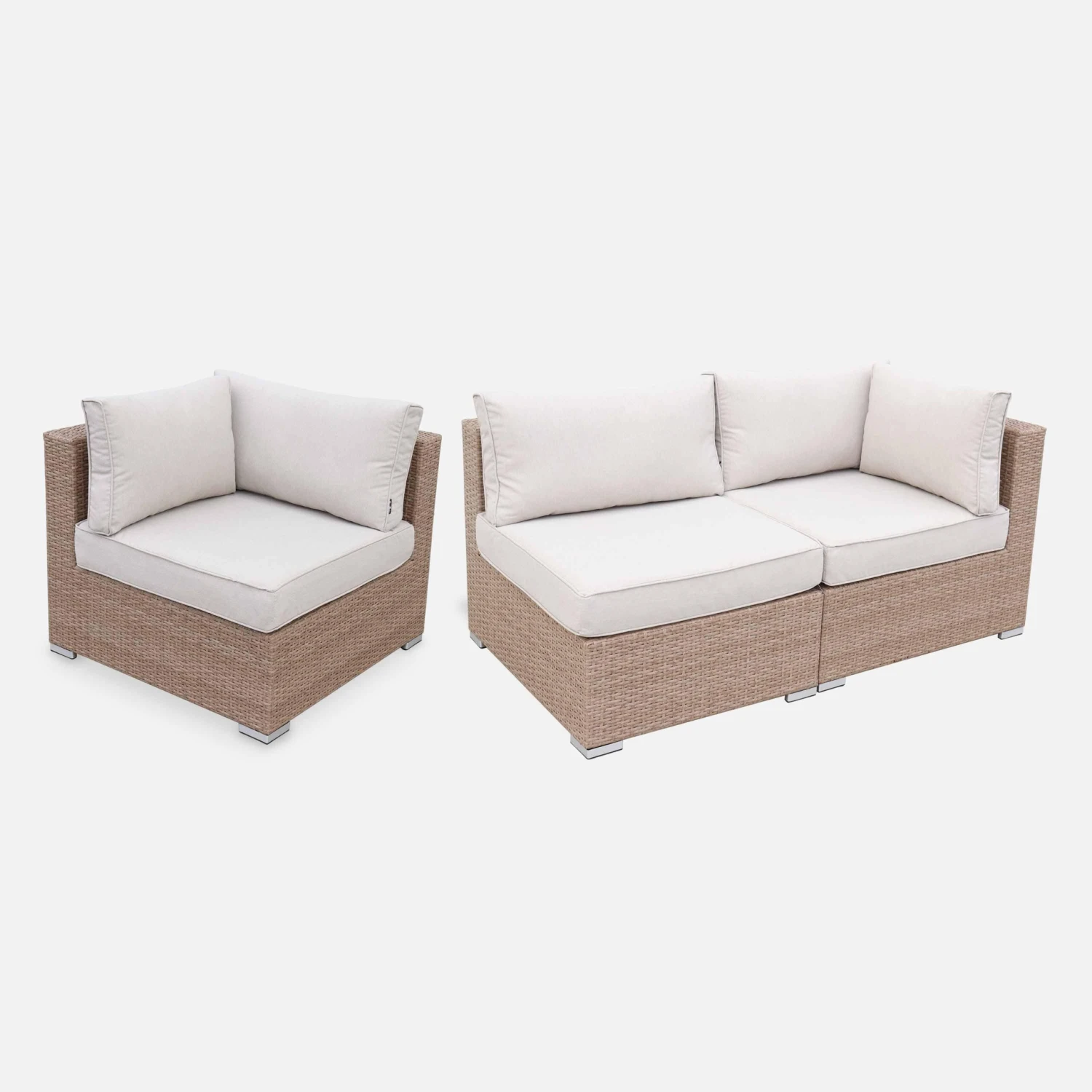 sweeek sélectionne avec attention la qualité de la matière choisie pour le tressage. De ce fait, la durée de vie du Venezia est exceptionnelle ! La résine tressée sweeek supporte les rayons du soleil et les intempéries (neige/ pluie / eaux salées). Les coussins sont déhoussables et résistants à l’eau. Pour garantir une résistance maximale, la structure du salon de jardin est en aluminium renforcé (ne rouille pas par nature). Les structures en aluminium sont, en plus, bien plus légères que les structures en acier. Le plateau en verre de la table basse est en verre trempé de 5mm d’épaisseur. C’est un verre 5 fois plus résistant que le verre traditionnel ! Le Venezia est livré avec un lot de 12 connecteurs pour fixer les différents modules ensemble.
