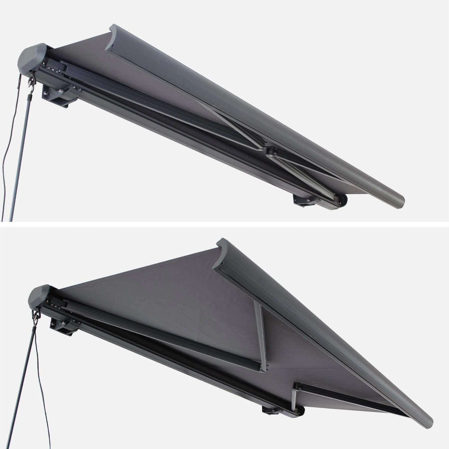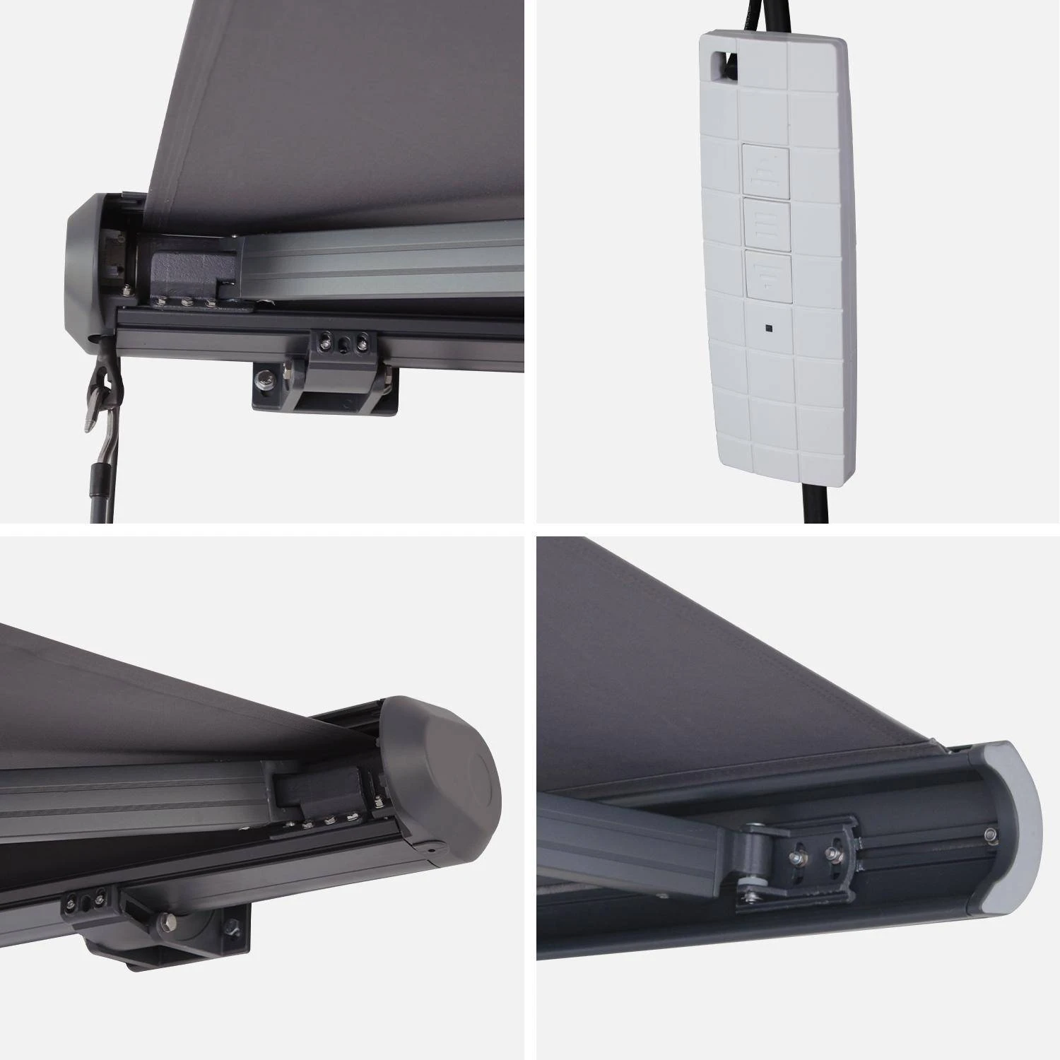 La toile est enroulée autour d’un tube en aluminium anodisé, robuste. La tension de cette toile se fait à l’aide de bras épais en aluminium, double câblage de tension, pour une toile tendue en permanence. Le déploiement et le rangement de la toile s’effectuent d’une simple pression sur la télécommande à radiofréquence. Il est également possible d’arrêter l’ouverture ou la fermeture en cours. Une manivelle est fournie en cas de panne de courant. Bien pensé, le store de terrasse Ombrec s’adapte à votre habitation, l’inclinaison de la pente se règle avec deux vis d’ajustement.
