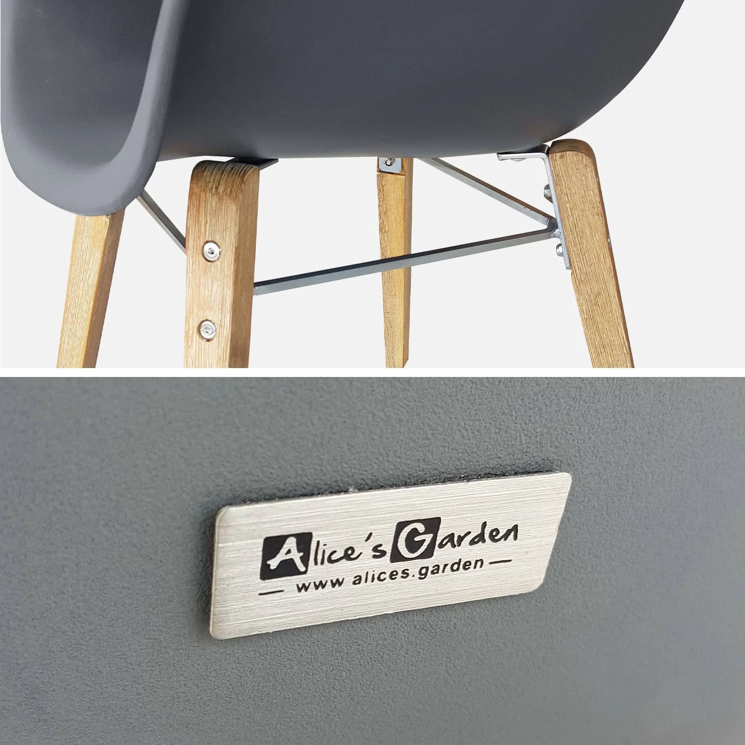 Le plateau de la table en fibre de ciment est épais de 5cm et est résistant à l’eau ainsi qu’aux intempéries. La coque des fauteuils est percée de trous pour laisser l’eau s’évacuer. Leur structure est en acier galvanisé et leurs pieds, en acacia brossé blanchi, sont assortis à ceux de la table.