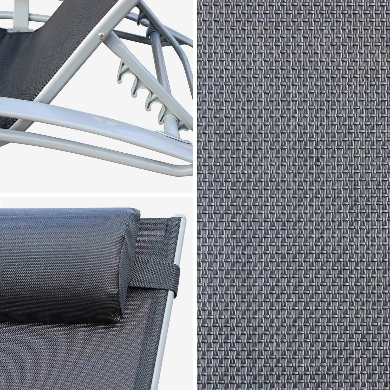 Les caractĂ©ristiques sont les mĂŞmes que pour vos transats d’origine : sont inclus la toile en textilène, la tĂŞtière dĂ©houssable et lavable Ă froid, l’armature en aluminium et le dossier inclinable Ă 6 niveaux.